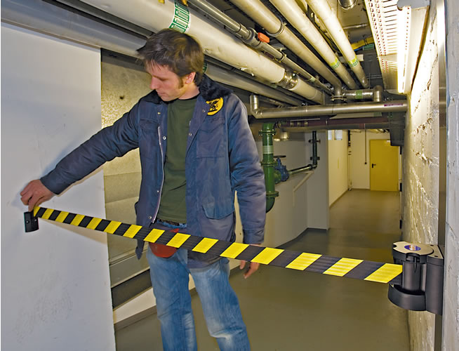 הרצועה קלה להתקנה ולהסרה מהקיר (אביזר). קפיץ המתח בתוך בית החגורה מבטיח חזרה מבוקרת של הרצועה לבית הרצועה באופן עצמי.